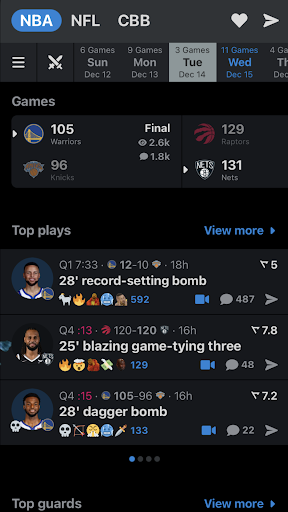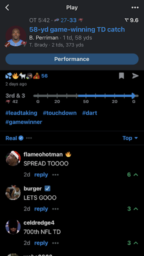 This app is fantastic for a lot of reasons. But mainly the feed on all games is freaking awesome. The easily accessible stats are a late-to-the-game better's dream. And they got all the sports(but disc golf). I use this app daily as a sports fan and am also entertained and appreciative to the community when I need to know what's going on in the game(s) I'm interested in. Let's go, Real!