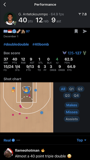 This is honestly the best sports app. It has very in depth stats as well. Assist breakdowns in the NBA are very cool way to show which players did that specific player share the ball to most. Also, it's not just a score app. It has a whole community inside of it. Happy to be a part of the early days of Real. Could add much more stuff, such as maybe the UFL, or other sports, but they are growing.
